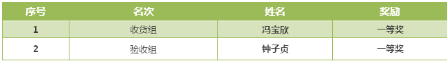 經(jīng)過評(píng)審團(tuán)的嚴(yán)格審核,比賽共評(píng)出一等獎(jiǎng)2名,兩名獲勝者驗(yàn)收和收貨完全正確且速度均排名前二,是所有驗(yàn)收組員工值得學(xué)習(xí)的榜樣。獲獎(jiǎng)名單如下: